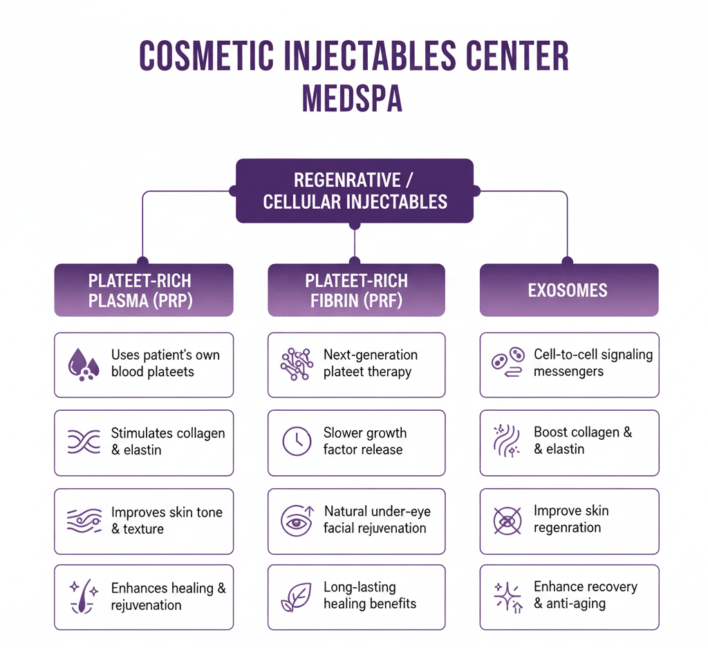 Platelet-rich plasma (PRP), platelet-rich fibrin (PRF), and exosomes represent the forefront of regenerative injectables, offering cell-based and cell-free options for tissue repair, wound healing, and aesthetic rejuvenation. These therapies leverage autologous or bioactive molecules to stimulate healing, modulate inflammation, and promote collagen synthesis. At Cosmetic Injectables Center Medspa, all regenerative injectable procedures are performed by certified expert injectors under the direct medical supervision of Dr. Sherly Soleiman, MD, a board-certified physician and national leader in medical aesthetics.